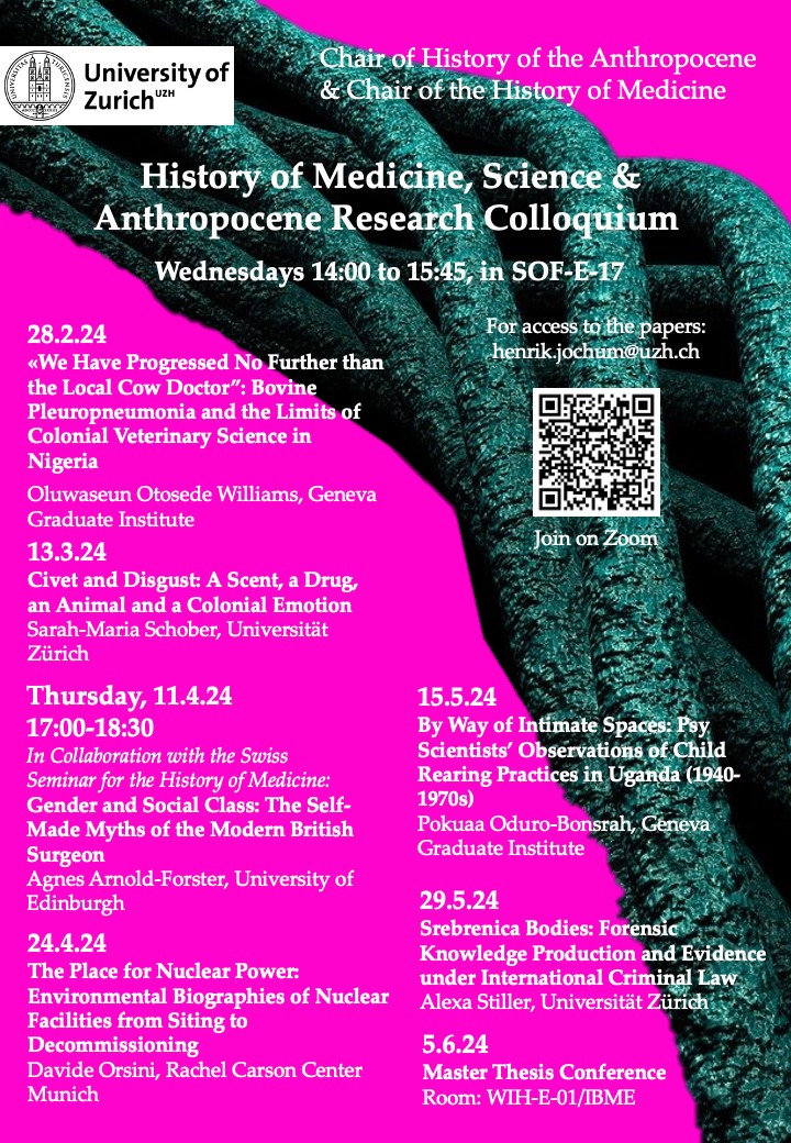 Visit the joint reseach colloquium “History of Medicine and History of the Anthropocene“. The presentations will take place on six wednesdays, from 14:00 until 15:45 in the room SOF-E-17 of the University of Zurich (except the Master thesis conference, which will take place in the room WIH-E-01/IBME) and on one thursday from 17:00 until 18:30 in the same room (SOF-E-17). You can also visit the colloquium via Zoom.