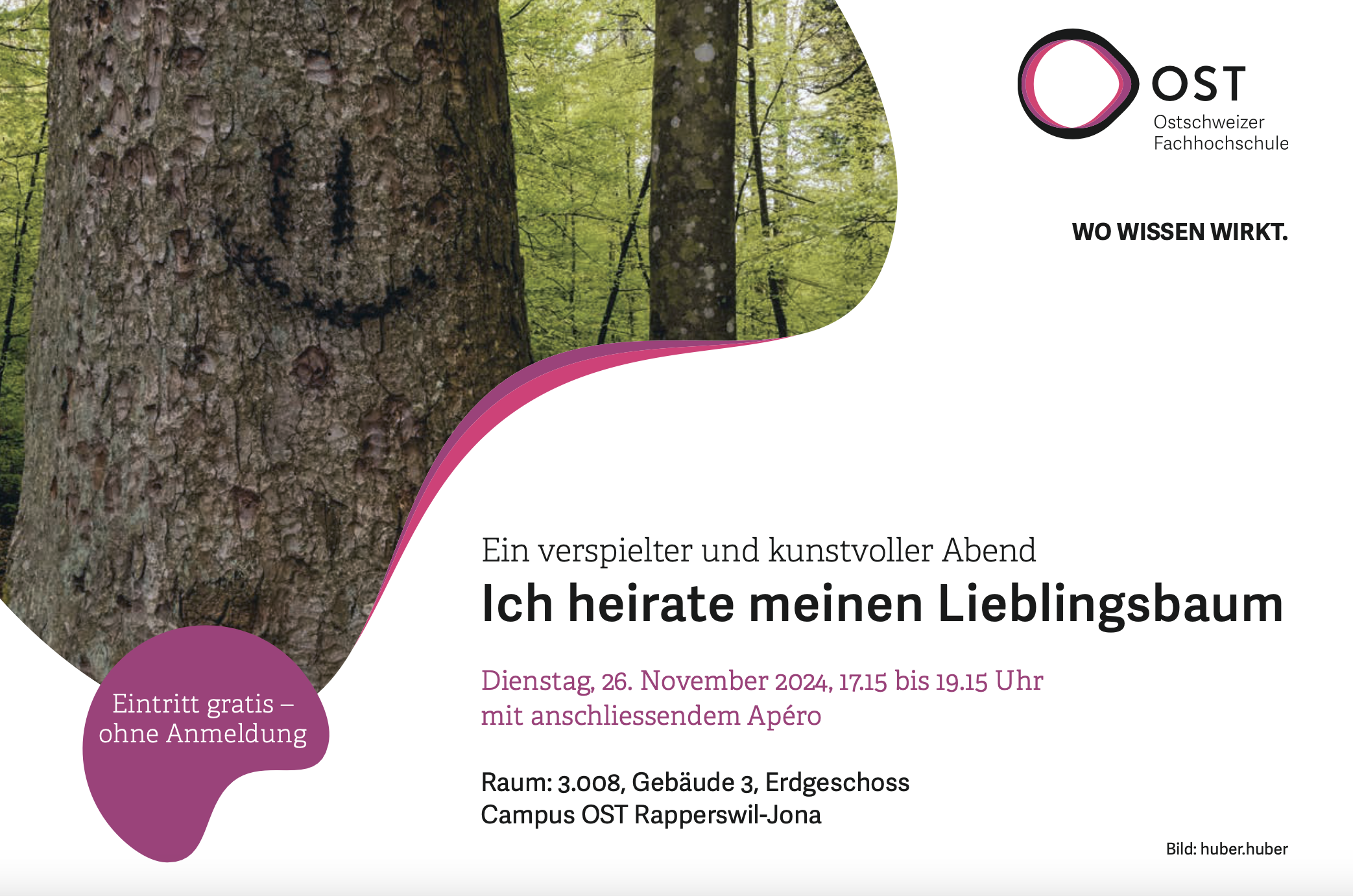 We approach these questions through the playful and critical lens of art as well as on the basis of binding rules of jurisprudence. The artist duo huber.huber and the curators Céline Gaillard and Simone Kobler of the exhibition “Denn in den Wäldern sind Dinge...” at the Kunst(Zeug)Haus Rapperswil-Jona will provide an inspiring introduction to the evening. Afterwards, we invite you to a joint experiment: Would you marry a tree on the Rapperswil campus?